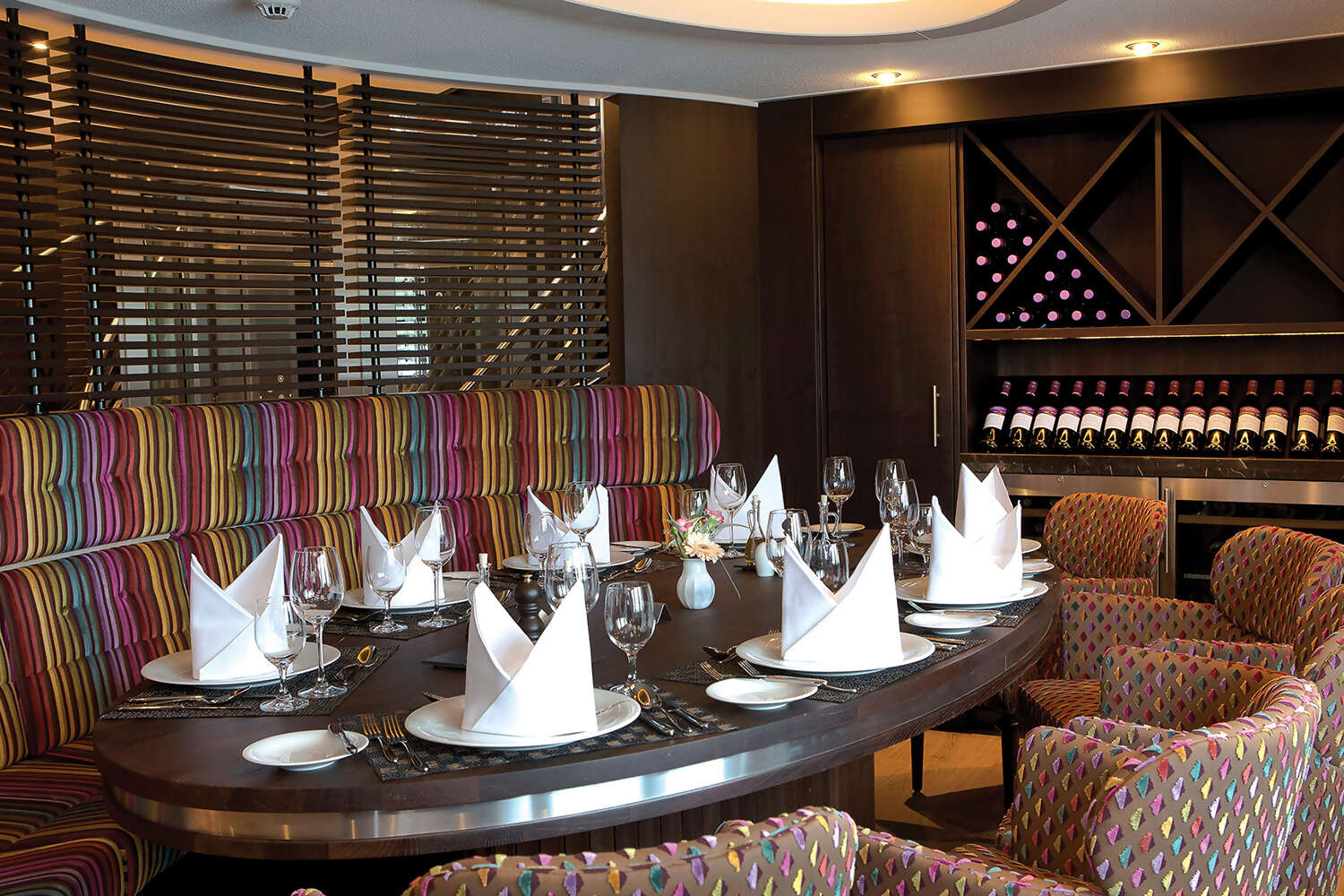 AmaWaterways award-winning AmaSonata sings her melodious tune down Europe’s great rivers. Most accommodations have twin balconies, so you can enjoy the ever-changing scenery however you wish, along with amenities like Entertainment-On-Demand, high-speed Internet access and English-language TV stations. A soft color palette in each stateroom calms the mind for relaxation, but when you’re ready to get active, head to the fitness center or up to the Sun Deck to the heated pool. Crisp white tablecloths and napkins grace the tables in the subdued Main Dining Room, while The Chef’s Table specialty restaurant highlights its 5-star multi-course cuisine with gold-hued tones and a twinkling overhead centerpiece. With a stunning Main Lounge, tranquil library, sun-deck walking track, massage and hair salon, and gift shop, you’ll never find a dull moment—and will sing AmaSonata’s praises while sailing on board.